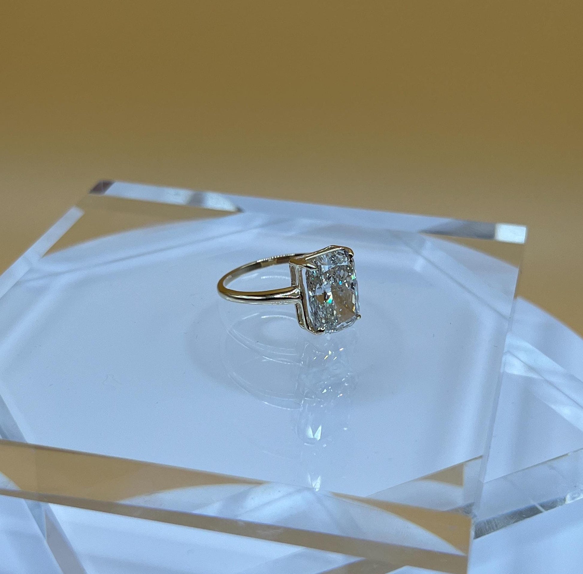 Elegant 3 carat elongated cushion cut lab grown diamond ring in 14K gold. Certified, ethical, and made to shine for your perfect proposal.